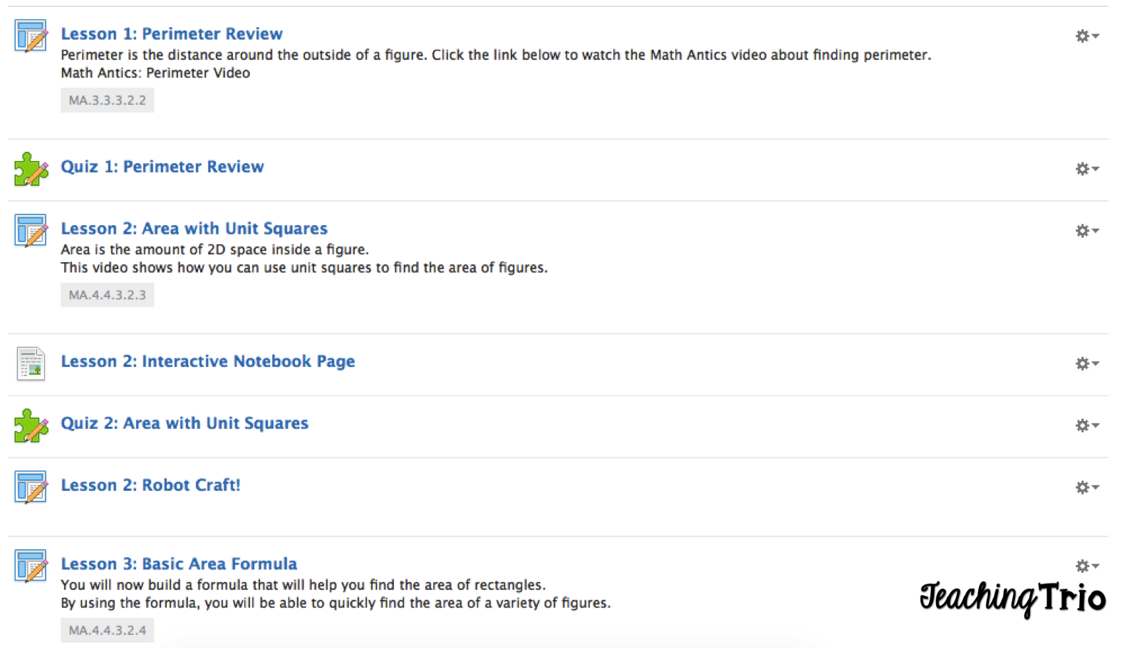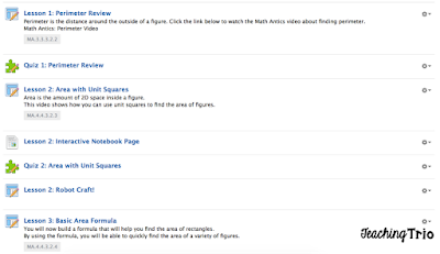 Each of my lessons start with a video. I also pulled some videos from Khan Academy and YouTube (but more about that during another Tech Thursday... hint hint). Under the settings icon (on the right side) you can link standards, change when items are available to your students or give items specific due dates.