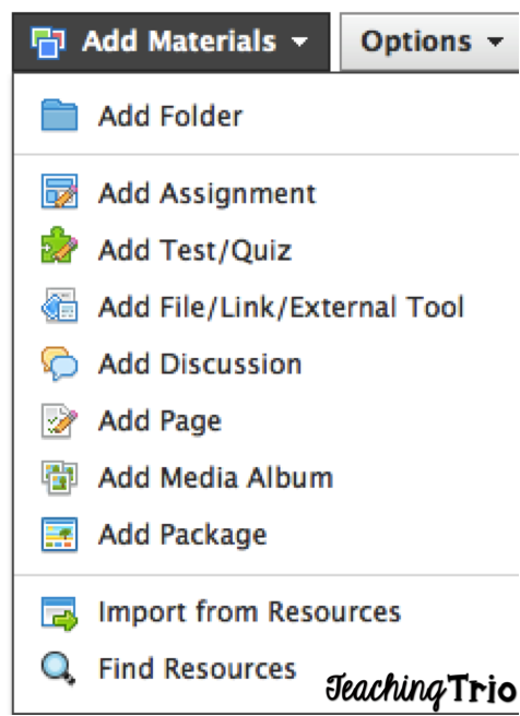 When you click into the actual folder you have a variety of options that you can use to add content to your course.